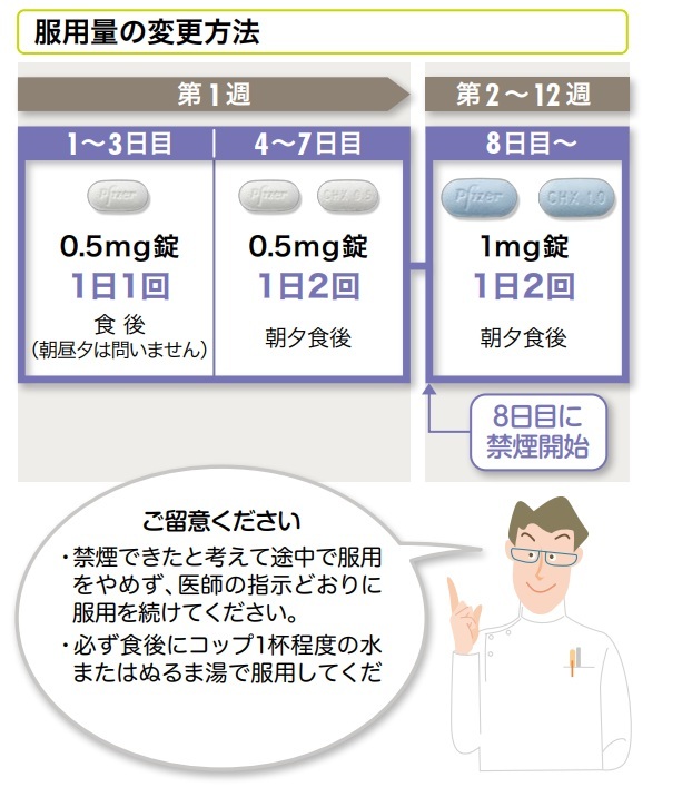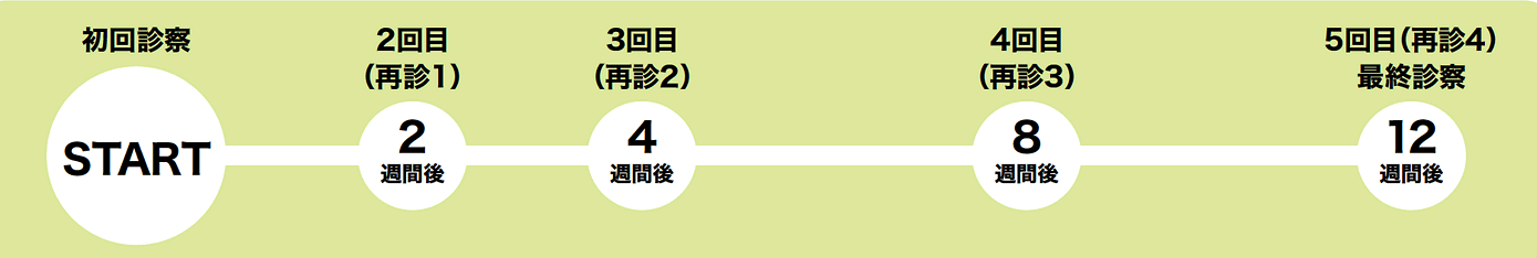 標準的な禁煙治療プログラムでは、初回診察で患者と話し合って禁煙開始日を決定し、初回診察から2週後、4週後、8週後、12週後の計5回、禁煙の継続のための治療を行います。